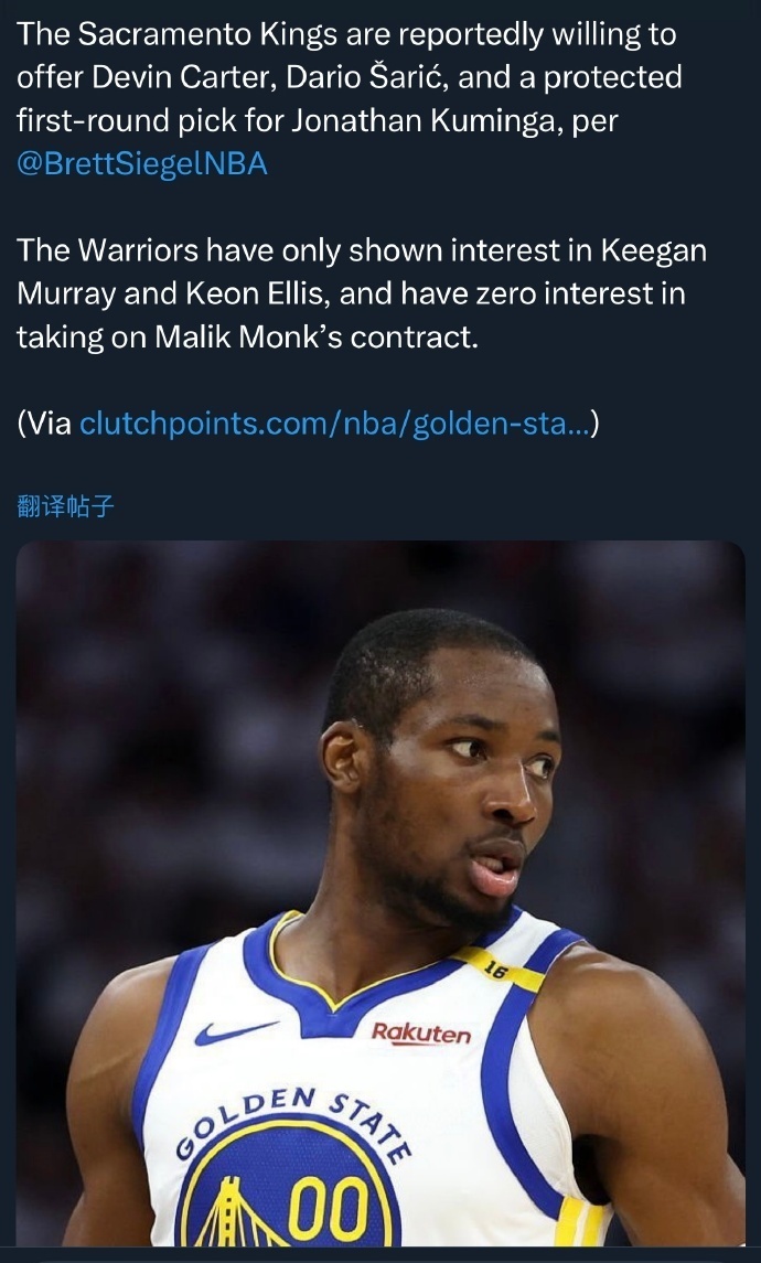 值得一提的是,根据此前Clutch Points记者Brett Siegel报道,国王愿意向勇士的报价为:卡特+萨里奇+1个受保护首轮,但勇士显然对于如此报价不满意。